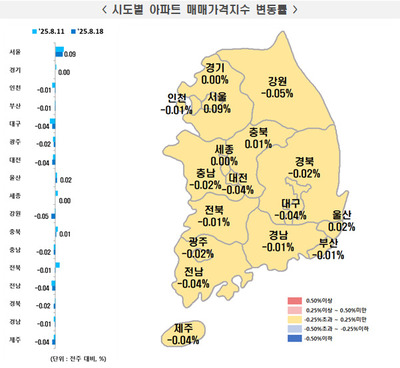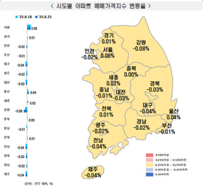 시도별로는 전북(0.07%), 충북(0.04%), 울산(0.02%) 등은 상승했으며 부산(0.00%) 등은 보합, 대구(-0.07%), 전남(-0.06%), 제주(-0.04%), 경북(-0.03%) 등은 하락했다.