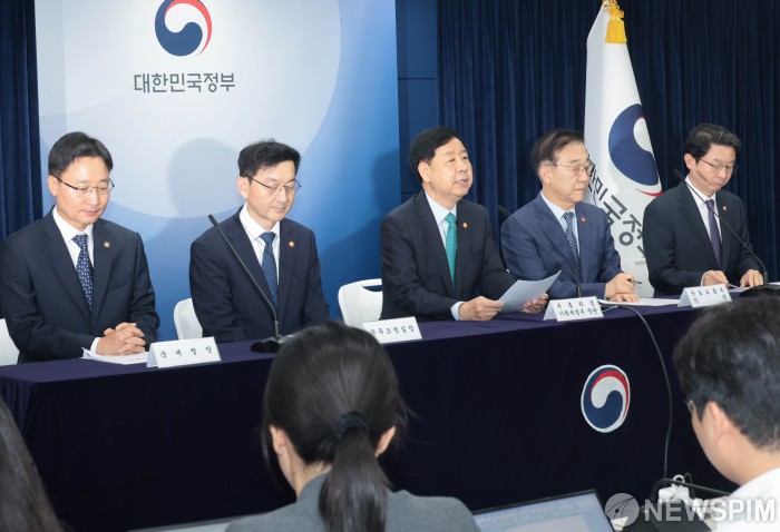 [서울=뉴스핌] 이길동 기자 = 구윤철 부총리 겸 기획재정부 장관이 15일 오전 서울 종로구 정부서울청사에서 열린 주택시장 안정화 대책 관계부처 합동브리핑에서 모두 발언을 하고 있다. 왼쪽부터 윤창렬 국무조정실장, 구 부총리, 김윤덕 국토교통부 장관. 2025.10.15 gdlee@newspim.com