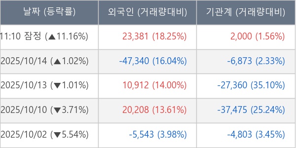 [장중수급포착] 비나텍, 외국인/기관 동시 순매수… 주가 +11.16%