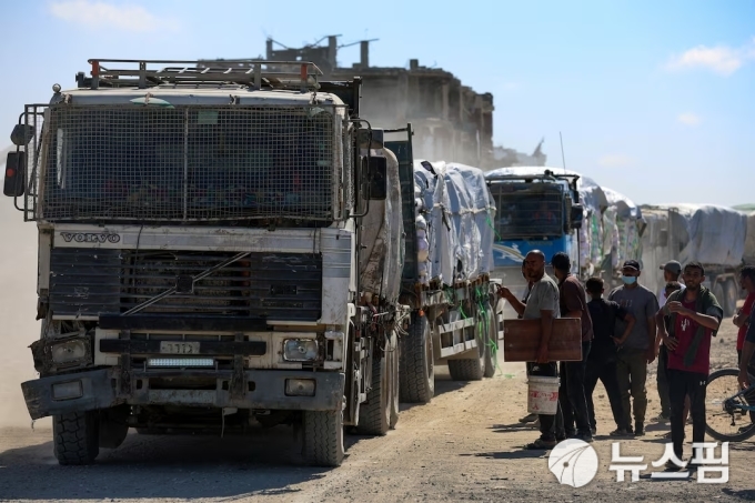 [가자지구 로이터=뉴스핌] 장일현 특파원 = 구호물품을 실은 트럭들이 14일(현지 시간) 팔레스타인 가자지구 남부 도시인 칸유니스 지역으로 들어가고 있다. 2025.10.15. ihjang67@newspim.com