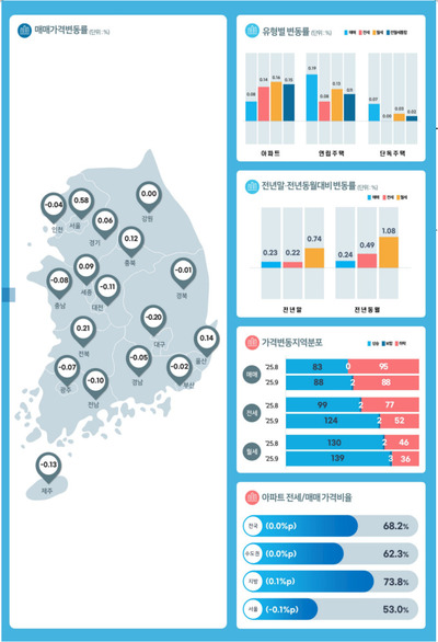 17일 한국부동산원의 2025년 10월 전국주택가격동향조사 결과 매매가격지수는 전국 0.29%, 수도권 0.60%, 서울 1.19%, 지방 0.00%로 각각 집계됐다.