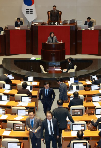 | [서울=뉴스핌] 윤창빈 기자 = 지난 12일 서울 여의도 국회에서 열린 본회의에서 이헌승 국민의힘 의원이 은행법 일부개정법률안에 대한 무제한 토론을 시작하자 더불어민주당 의원들이 회의장을 나서고 있다. pangbin@newspim.com |