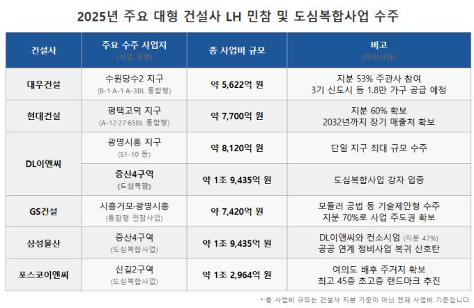 이 밖에도 포스코이앤씨는 영등포구 신길2구역(총사업비 약 1조2000억원)을, GS건설은 도봉구 쌍문역 서측 지구(공사비 5908억원)를 각각 수주하며 서울 내 알짜 입지를 선점했다. 이들 사업장은 '자이', '더샵', '래미안' 등 프리미엄 브랜드를 적용, 공공주택의 품질을 민간 분양 아파트 수준으로 끌어올릴 전망이다.