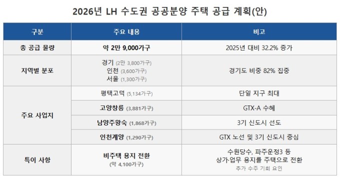 실제 LH는 2026년 3기 신도시(남양주 왕숙, 하남 교산 등)와 평택고덕 등을 중심으로 전년 대비 32.2% 증가한 2만9000가구 규모의 공공분양을 계획하고 있다. 특히 상가·업무 용지를 주택 용지로 전환해 공급하는 수원당수, 파주운정3 지구 등의 추가 물량은 건설사들에 새로운 기회가 될 것으로 보인다.