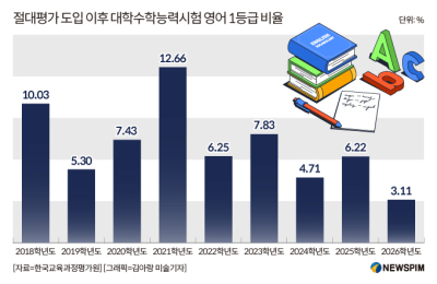 2026학년도 수능 영어 영역 1등급 비율은 3.11%로, 영어가 절대평가로 바뀐 2018학년도 이래 가장 낮은 비율을 기록했다. 상대평가 1등급 비율(4%)에도 미치지 못하는 수준이다.