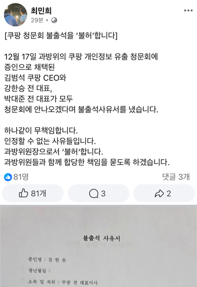 | 최민희 위원장은 14일 페이스북에 "오는 17일 과방위의 쿠팡 개인정보 유출 청문회에 증인으로 채택된 김범석 쿠팡Inc CEO와 강한승 전 대표, 박대준 전 대표가 모두 청문회에 안 나오겠다며 불출석사유서를 냈다"고 밝혔다. [사진=최민희 과방위원장 페이스북 페이지 갈무리] |