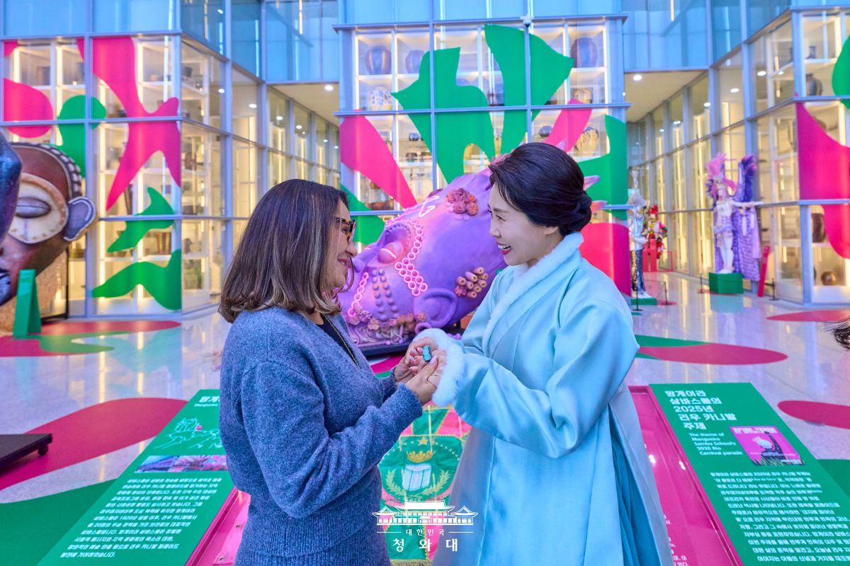 두 여사는 박물관에서 '브라질 리우 카니발: 아프리카의 영혼, 삼바의 리듬' 전시와 한국의 전통 민속 공예품을 관람하기도 했다. 다 시우바 여사는 '망게이라 삼바스쿨' 깃발과 퍼레이드 구조물 등 대표 전시물을 살펴본 뒤 "삼바 축제에 방문해 달라"고 김 여사에게 요청했다. 김 여사는 "다 시우바 여사와 전시를 보게 되어 영광"이라고 화답했다.