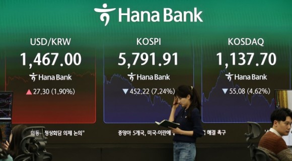 이날 코스피는 전 거래일보다 3.44% 내린 5592.59로, 코스닥은 2.25% 내린 1112.08로 개장했으나 직후 하락폭을 확대하며 각각 6%까지 빠졌다.