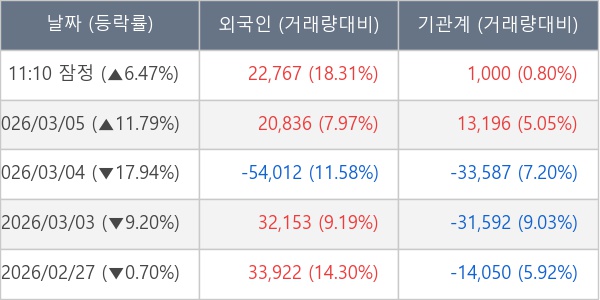 홈 주요뉴스 기타 [장중수급포착] 코스모화학, 외국인/기관 동시 순매수… 주가 +6.47% 기사등록 : 2026년03월06일 11:35 가가 공유 ※ 뉴스 공유하기 카카오톡 페이스북 트위터 주소복사 URL 복사완료 닫기 ※ 본문 글자 크기 조정 가더 작게 가작게 가보통 가크게 가더 크게 닫기 ※ 번역할 언어 선택 닫기 [서울=뉴스핌] 로보뉴스 = 06일 11시 30분 현재 코스모화학(005420)은 외국인과 기관이 각각 2.28 만 주, 0.10 만 주 순매수(잠정) 하면서 전일 대비 6.47% (현재가 15,140원) 상승하고 있다.[표] 외국인ㆍ기관 순매매량 (단위 주) [표] 주요 기관별 순매매량 (단위 주) ※ 사모펀드 등 일부 기관의 순매매량은 표시되지 않음[그래프] 주체별 매매동향 (잠정) ※ 장중 매매동향은 잠정치이므로 실제 매매동향과 차이가 발생할수 있음[표] 거래원 상위(11:30 기준) 이 기사는 뉴스핌과 금융 AI 전문기업 씽크풀이 공동 개발한 기사 자동생성 알고리즘에 의해 실시간으로 작성된 것입니다. 인사 부고 오늘의 운세 관련기사 TOP으로 이동 뒤로가기 닫기