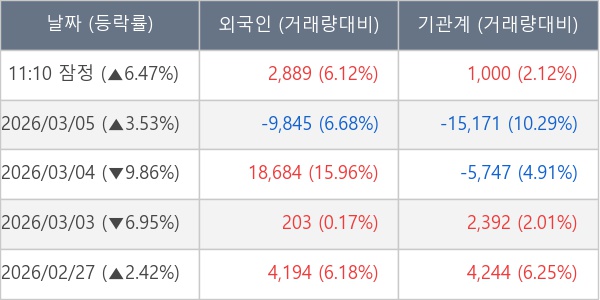 홈 주요뉴스 기타 [장중수급포착] 한솔케미칼, 외국인/기관 동시 순매수… 주가 +6.47% 기사등록 : 2026년03월06일 11:35 가가 공유 ※ 뉴스 공유하기 카카오톡 페이스북 트위터 주소복사 URL 복사완료 닫기 ※ 본문 글자 크기 조정 가더 작게 가작게 가보통 가크게 가더 크게 닫기 ※ 번역할 언어 선택 닫기 [서울=뉴스핌] 로보뉴스 = 06일 11시 30분 현재 한솔케미칼(014680)은 외국인과 기관이 각각 0.29 만 주, 0.10 만 주 순매수(잠정) 하면서 전일 대비 6.47% (현재가 312,500원) 상승하고 있다.[표] 외국인ㆍ기관 순매매량 (단위 주) [표] 주요 기관별 순매매량 (단위 주) ※ 사모펀드 등 일부 기관의 순매매량은 표시되지 않음[그래프] 주체별 매매동향 (잠정) ※ 장중 매매동향은 잠정치이므로 실제 매매동향과 차이가 발생할수 있음[표] 거래원 상위(11:30 기준) 이 기사는 뉴스핌과 금융 AI 전문기업 씽크풀이 공동 개발한 기사 자동생성 알고리즘에 의해 실시간으로 작성된 것입니다. 인사 부고 오늘의 운세 관련기사 TOP으로 이동 뒤로가기 닫기