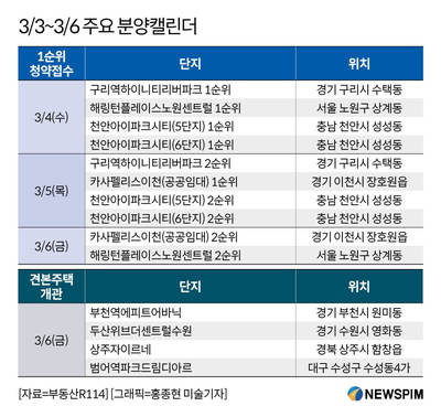 [서울=뉴스핌] 송현도 기자 = 7일 부동산R114에 따르면 3월 둘째 주에는 전국 3개 단지에서 총 2070가구가 공급된다. 이 중 일반분양 물량은 1279가구다.
