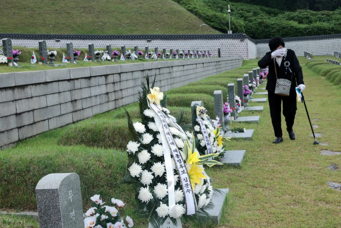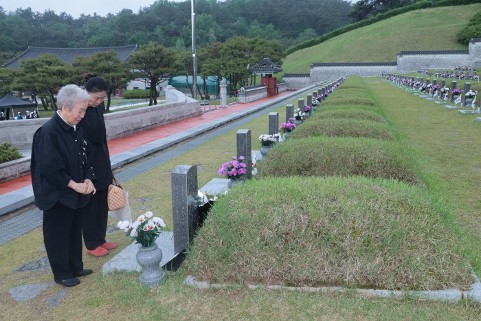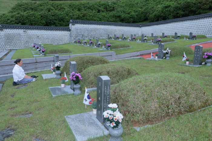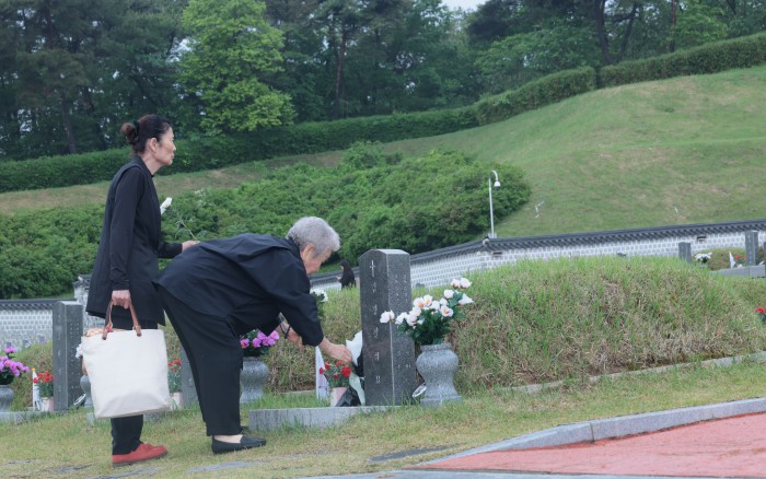 [광주=뉴스핌] 이길동 기자 = 5·18민주화운동 45주기를 하루 앞둔 17일 오전 광주 북구 운정동 국립 5·18민주묘지에서 유가족이 희생자를 추모하고 있다. 2025.05.17 gdlee@newspim.com