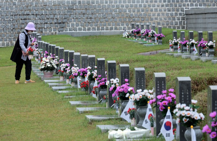 [광주=뉴스핌] 이길동 기자 = 5·18민주화운동 45주기를 하루 앞둔 17일 오전 광주 북구 운정동 국립 5·18민주묘지에서 유가족이 희생자를 추모하며 묘역을 정리하고 있다. 2025.05.17 gdlee@newspim.com