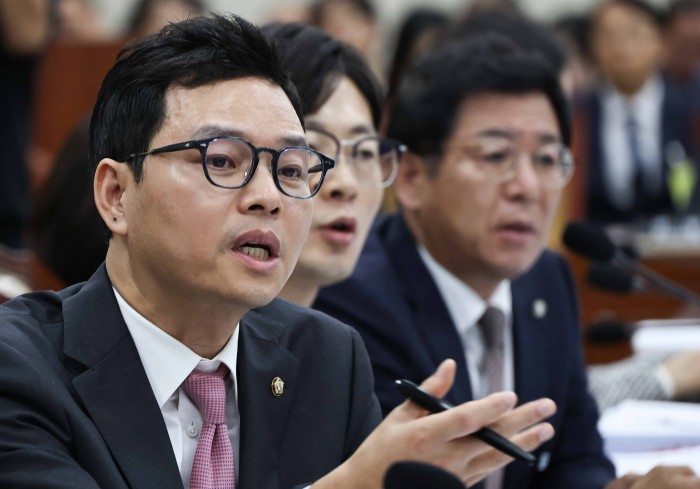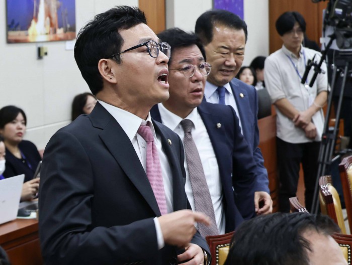 [서울=뉴스핌] 윤창빈 기자 = 김우영 더불어민주당 의원이 14일 오후 서울 여의도 국회에서 열린 과학기술정보방송통신위원회의 방송통신위원회 등에 대한 국정감사에서 질의 도중 박정훈 국민의힘 의원의 문자메세지 공개와 관련해 박 의원의 항의가 있자 자리에 일어나 있다. 2025.10.14 pangbin@newspim.com