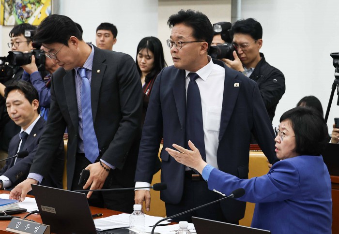 [서울=뉴스핌] 윤창빈 기자 = 14일 오후 서울 여의도 국회에서 열린 과학기술정보방송통신위원회의 방송통신위원회 등에 대한 국정감사에서 김우영 더불어민주당 의원 질의 도중 박정훈 국민의힘 의원의 문자메세지 공개와 관련해 여야 의원들이 언쟁을 벌이고 있다. 2025.10.14 pangbin@newspim.com