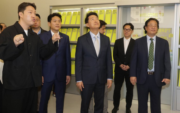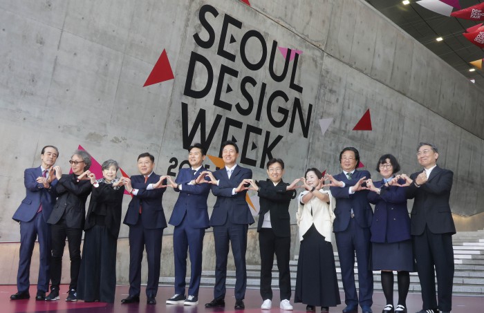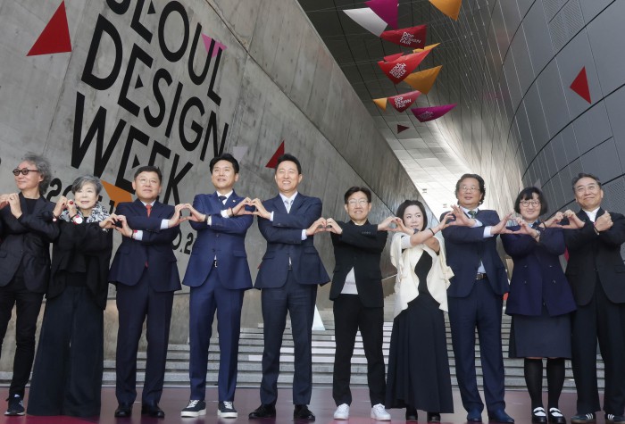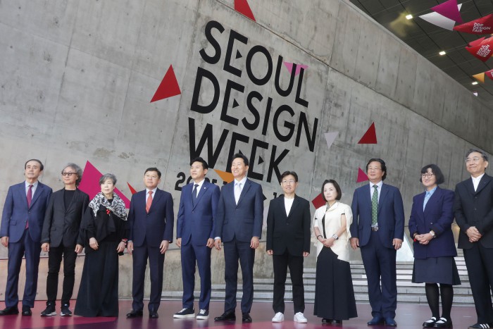 [서울=뉴스핌] 양윤모 기자 = 오세훈 서울시장(왼쪽 다섯번째)이 15일 오전 서울 동대문디자인플라자(DDP) 아트홀입구에서 개최된 국내외 디자이너와 기업이 참여하는 디자인 비즈니스 페어인 '서울디자인위크 개막식'에 참석해 기념촬영을 하고 있다.