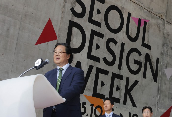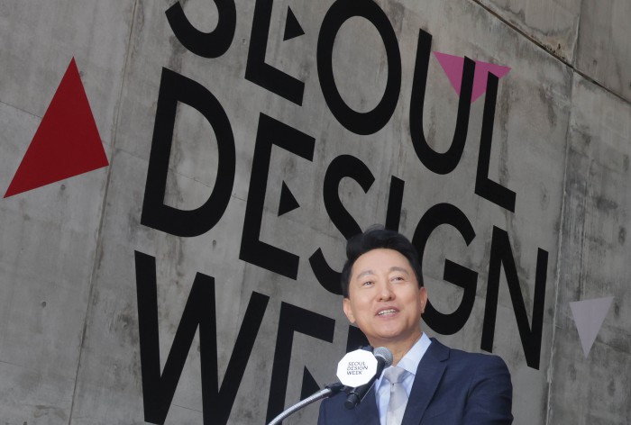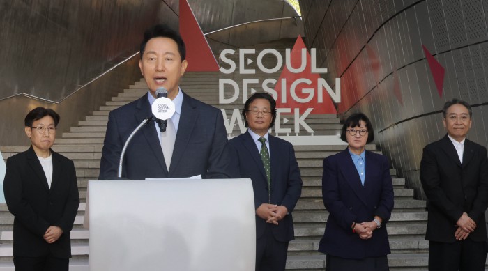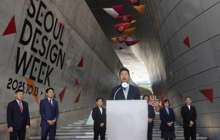 [서울=뉴스핌] 양윤모 기자 = 오세훈 서울시장이 15일 오전 서울 동대문디자인플라자(DDP) 아트홀입구에서 개최된 국내외 디자이너와 기업이 참여하는 디자인 비즈니스 페어인 '서울디자인위크 개막식'에 참석해 개회사를 하고 있다.