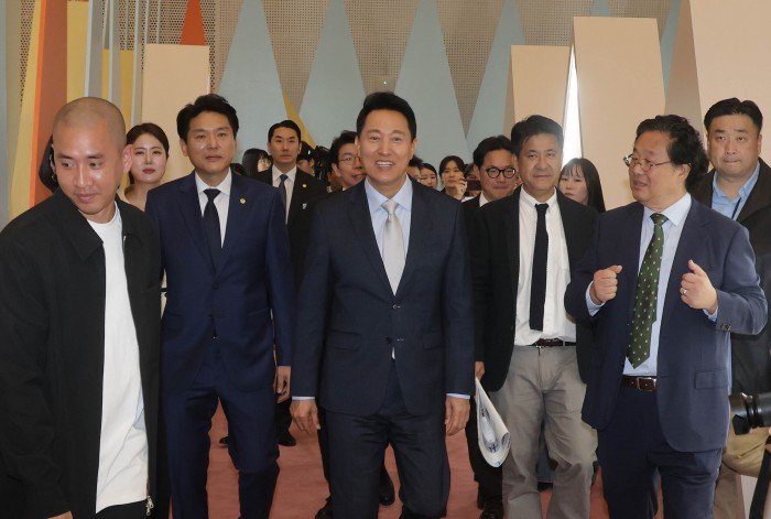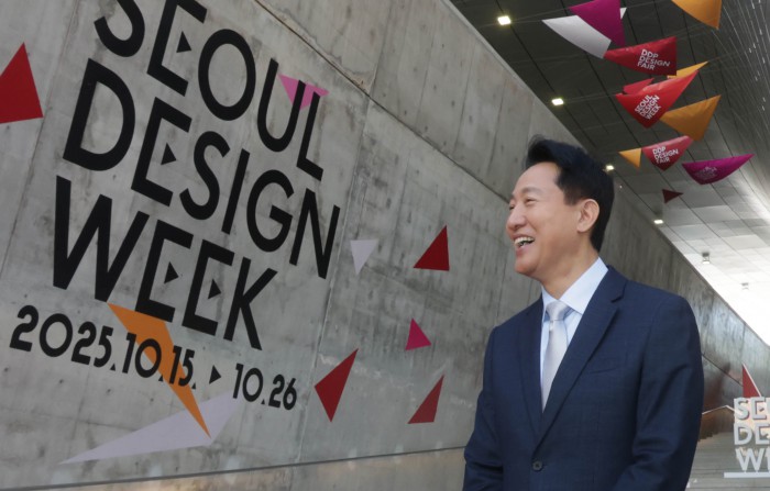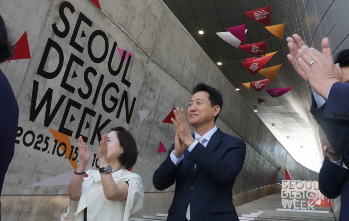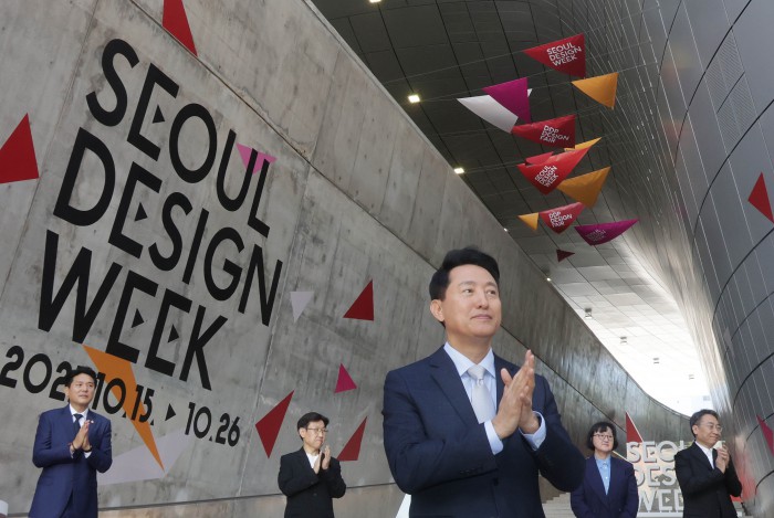 [서울=뉴스핌] 양윤모 기자 = 오세훈 서울시장이 15일 오전 서울 동대문디자인플라자(DDP) 아트홀입구에서 개최된 국내외 디자이너와 기업이 참여하는 디자인 비즈니스 페어인 '서울디자인위크 개막식'에 참석해 박수치고 있다.