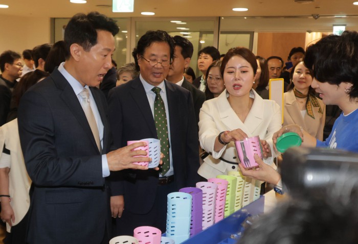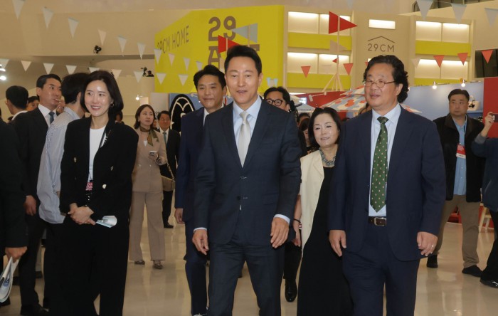 [서울=뉴스핌] 양윤모 기자 = 오세훈 서울시장이 15일 오전 서울 동대문디자인플라자(DDP) 아트홀에서 개최된 ‘DDP디자인페어’를 차강희 서울디자인재단 대표이사와 함께 관람하고 있다.