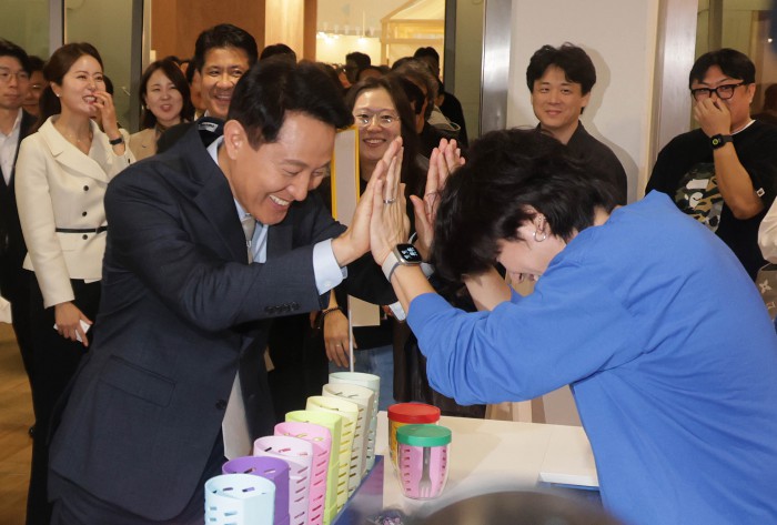 [서울=뉴스핌] 양윤모 기자 = 오세훈 서울시장이 15일 오전 서울 동대문디자인플라자(DDP) 아트홀에서 개최된 ‘DDP디자인페어’ 전시장에서 시민들과 하이파이브를 하고 있다.