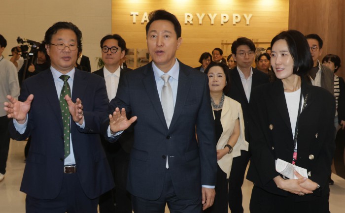 [서울=뉴스핌] 양윤모 기자 = 오세훈 서울시장이 15일 오전 서울 동대문디자인플라자(DDP) 아트홀입구에서 개최된 국내외 디자이너와 기업이 참여하는 디자인 비즈니스 페어인 '서울디자인위크 개막식'에 참석해 활짝 웃고 있다.