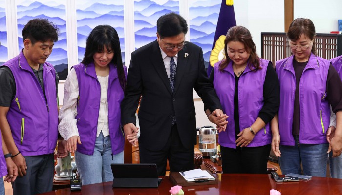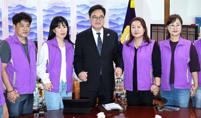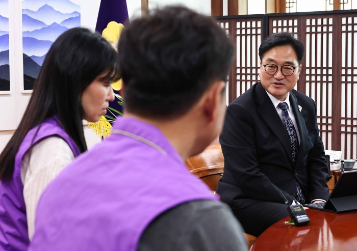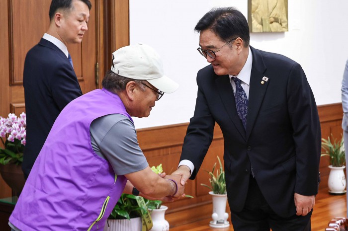 [서울=뉴스핌] 윤창빈 기자 = 우원식 국회의장이 15일 오후 서울 여의도 국회에서 10.29 이태원참사 유가족들과 면담 전 인사를 나누고 있다. 2025.10.15 pangbin@newspim.com