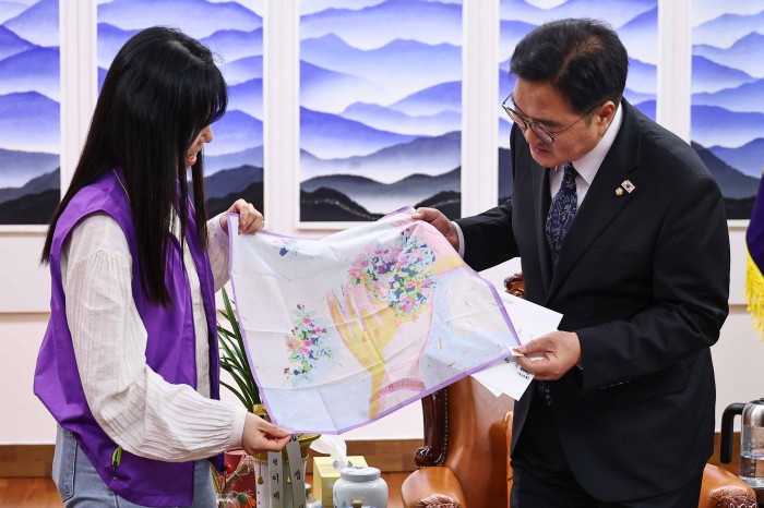 [서울=뉴스핌] 윤창빈 기자 = 우원식 국회의장이 15일 오후 서울 여의도 국회에서 10.29 이태원참사 유가족으로 부터 손수건을 선물 받고 있다. 2025.10.15 pangbin@newspim.com