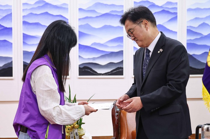 [서울=뉴스핌] 윤창빈 기자 = 우원식 국회의장이 15일 오후 서울 여의도 국회에서 10.29 이태원참사 유가족으로 부터 이태원 참사 3주기 추모행사 초청장을 받고 있다. 2025.10.15 pangbin@newspim.com