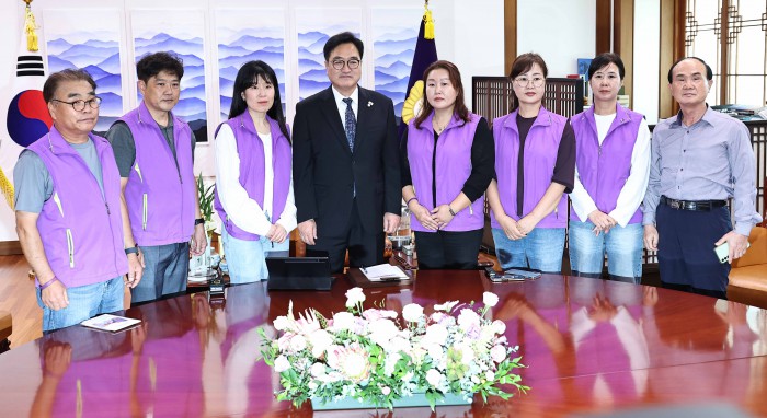 [서울=뉴스핌] 윤창빈 기자 = 우원식 국회의장이 15일 오후 서울 여의도 국회에서 10.29 이태원참사 유가족들과 면담 전 기념촬영을 하고 있다. 2025.10.15 pangbin@newspim.com
