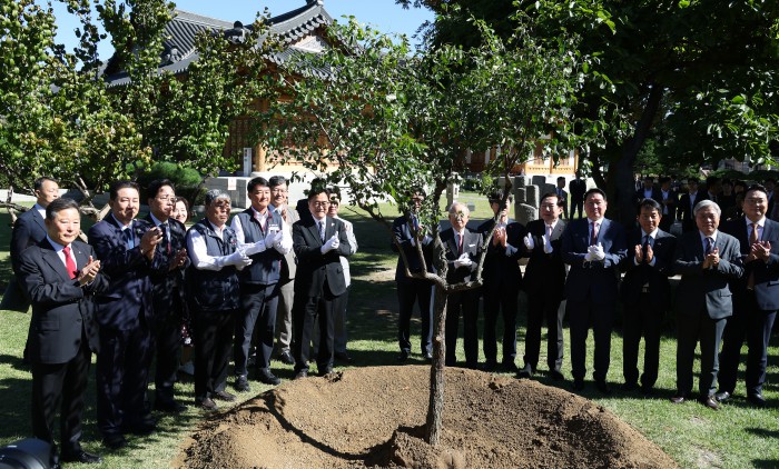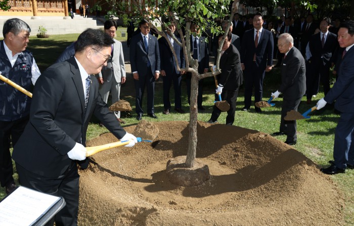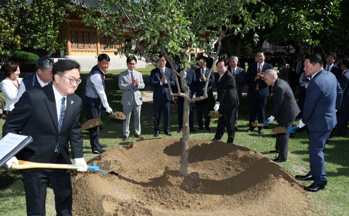 [서울=뉴스핌] 정일구 기자 = 우원식 국회의장과 노사 5단체 대표들이 15일 오전 서울 여의도 국회 사랑재에서 열린 국회 사회적 대화 공동 선언식에 앞서 기념식수를 하고 있다. 2025.10.15 mironj19@newspim.com