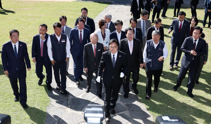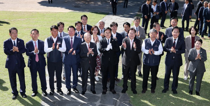 [서울=뉴스핌] 정일구 기자 = 우원식 국회의장과 노사 5단체 대표 등이 15일 오전 서울 여의도 국회 사랑재에서 열린 국회 사회적 대화 공동 선언식에 참석하며 기념촬영을 하고 있다. 2025.10.15 mironj19@newspim.com