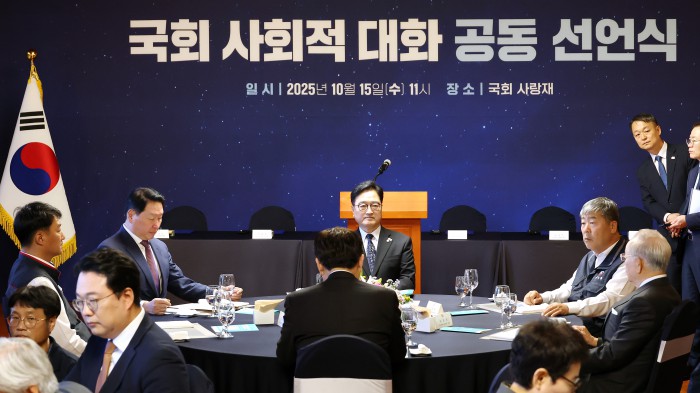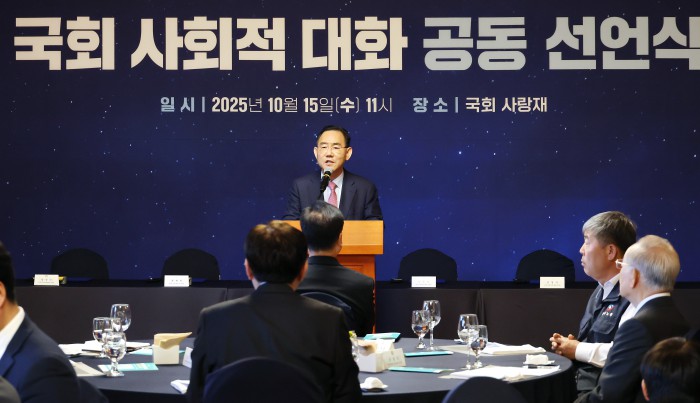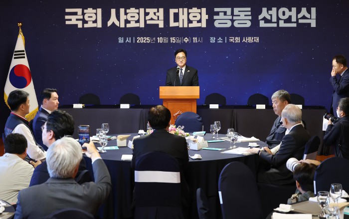 [서울=뉴스핌] 정일구 기자 = 우원식 국회의장이 15일 오전 서울 여의도 국회 사랑재에서 열린 국회 사회적 대화 공동 선언식에서 인사말을 하고 있다. 2025.10.15 mironj19@newspim.com