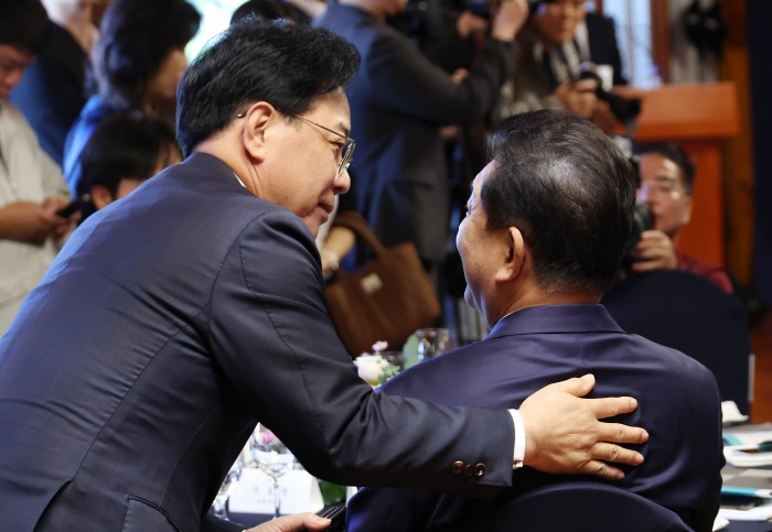 [서울=뉴스핌] 정일구 기자 = 김병기 더불어민주당 원내대표(오른쪽)와 송언석 국민의힘 원내대표가 15일 오전 서울 여의도 국회 사랑재에서 열린 국회 사회적 대화 공동 선언식에서 대화하고 있다. 2025.10.15 mironj19@newspim.com