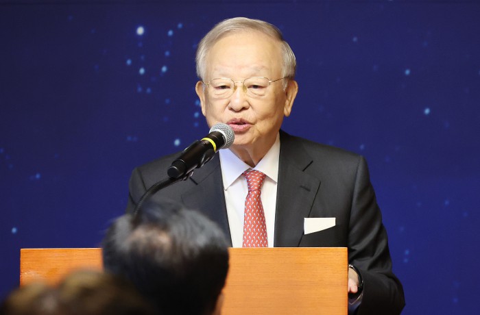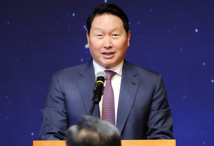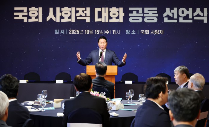 [서울=뉴스핌] 정일구 기자 = 최태원 대한상공회의소 회장이 15일 오전 서울 여의도 국회 사랑재에서 열린 국회 사회적 대화 공동 선언식에서 인사말을 하고 있다. 2025.10.15 mironj19@newspim.com