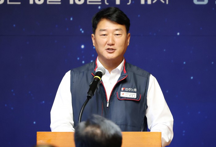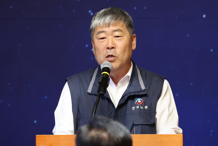 [서울=뉴스핌] 정일구 기자 = 양경수 민주노총 위원장이 15일 오전 서울 여의도 국회 사랑재에서 열린 국회 사회적 대화 공동 선언식에서 인사말을 하고 있다. 2025.10.15 mironj19@newspim.com
