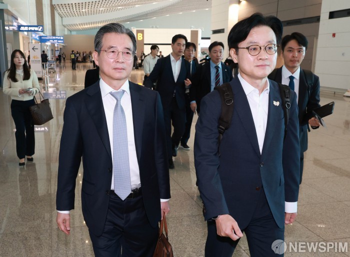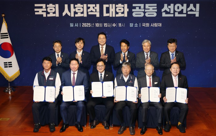 [서울=뉴스핌] 정일구 기자 = 우원식 국회의장과 노사 5단체 대표들이 15일 오전 서울 여의도 국회 사랑재에서 열린 국회 사회적 대화 공동 선언식에 참석해 있다. 2025.10.15 mironj19@newspim.com
