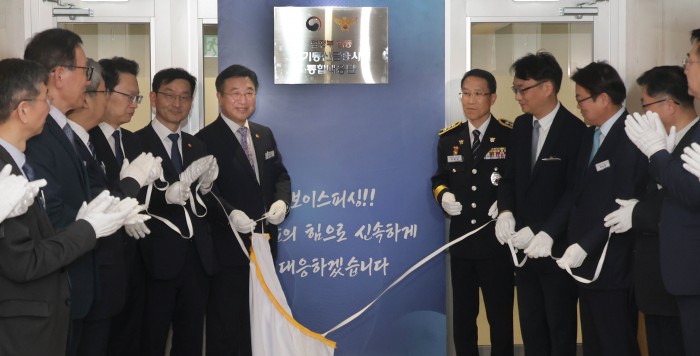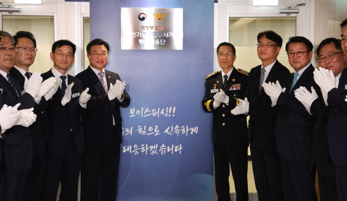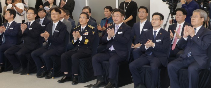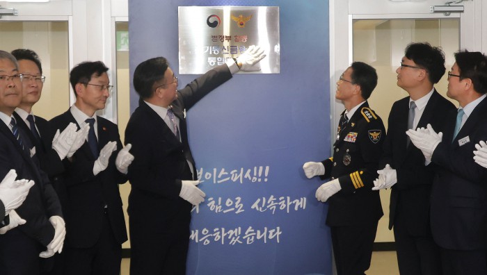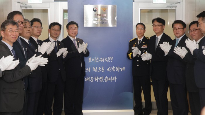 [서울=뉴스핌] 양윤모 기자 = 윤호중 행정안전부장관과 참석자들이 15일 오후 KT 광화문빌딩에서 개최된 범정부 합동 '전기통신금융사기 통합대응단' 개소식에 참석해 박수를 치고 있다. 2025.10.15 yym58@newspim.com