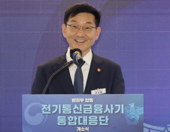 [서울=뉴스핌] 양윤모 기자 = 윤창렬 국무조정실장이 15일 오후 KT 광화문빌딩에서 개최된 범정부 합동 '전기통신금융사기 통합대응단' 개소식에 참석해 축사를 하고 있다. 2025.10.15 yym58@newspim.com