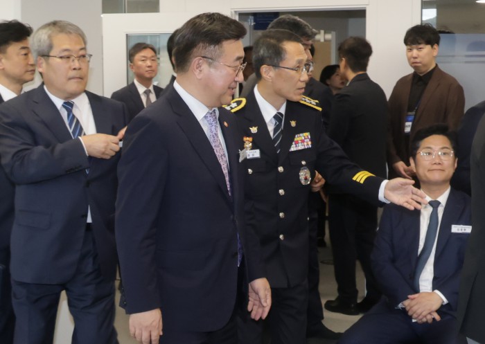 [서울=뉴스핌] 양윤모 기자 = 유재성 경찰청장 직무대행이 15일 오후 KT 광화문빌딩에서 개최된 범정부 합동 '전기통신금융사기 통합대응단' 개소식에 참석한 윤호중 행정안전부장관에게 자리를 안내하고 있다. 2025.10.15 yym58@newspim.com