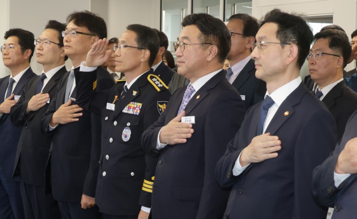 [서울=뉴스핌] 양윤모 기자 = 윤호중 행정안전부장관이 15일 오후 KT 광화문빌딩에서 개최된 범정부 합동 '전기통신금융사기 통합대응단' 개소식에 참석해 국민의례를 하고 있다. 2025.10.15 yym58@newspim.com