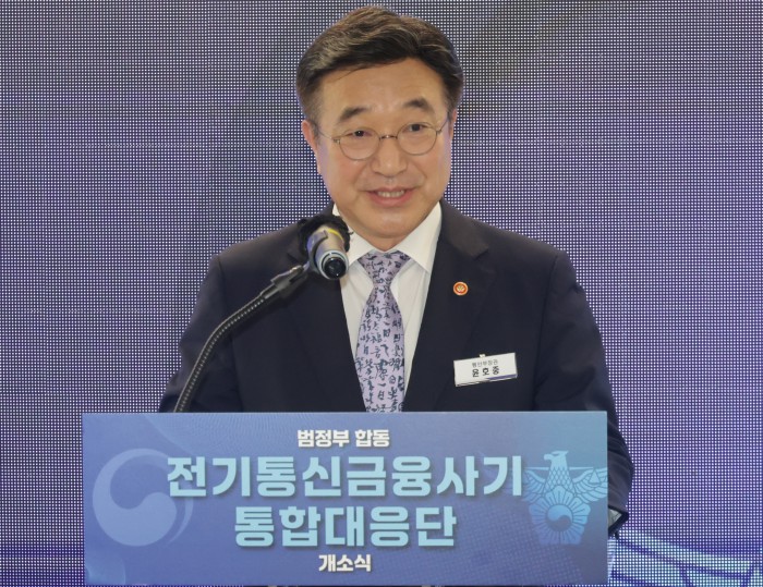 [서울=뉴스핌] 양윤모 기자 = 윤호중 행정안전부장관이 15일 오후 KT 광화문빌딩에서 개최된 범정부 합동 '전기통신금융사기 통합대응단' 개소식에 참석해 축사를 하고 있다. 2025.10.15 yym58@newspim.com