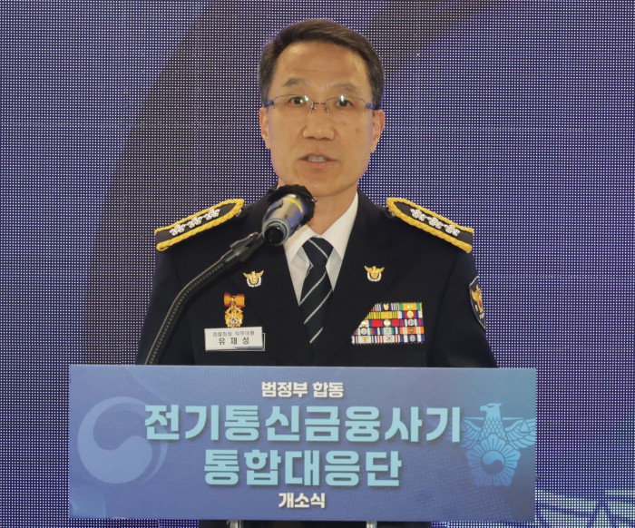 [서울=뉴스핌] 양윤모 기자 = 유재성 경찰청장 직무대행이 15일 오후 KT 광화문빌딩에서 개최된 범정부 합동 '전기통신금융사기 통합대응단' 개소식에 참석해 인사말을 하고 있다. 2025.10.15 yym58@newspim.com