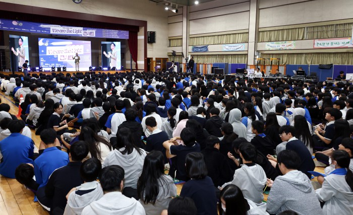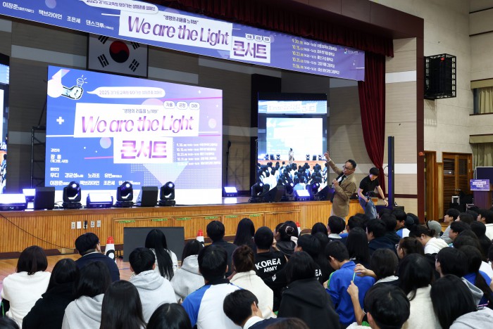[파주=뉴스핌] 최지환 기자 = 개그맨 장용이 15일 오후 경기 파주시 한가람중학교에서 열린 '2025 경기도교육청 찾아가는 생명존중 캠페인'에서 토크 강연을 하고 있다. 2025.10.15 choipix16@newspim.com