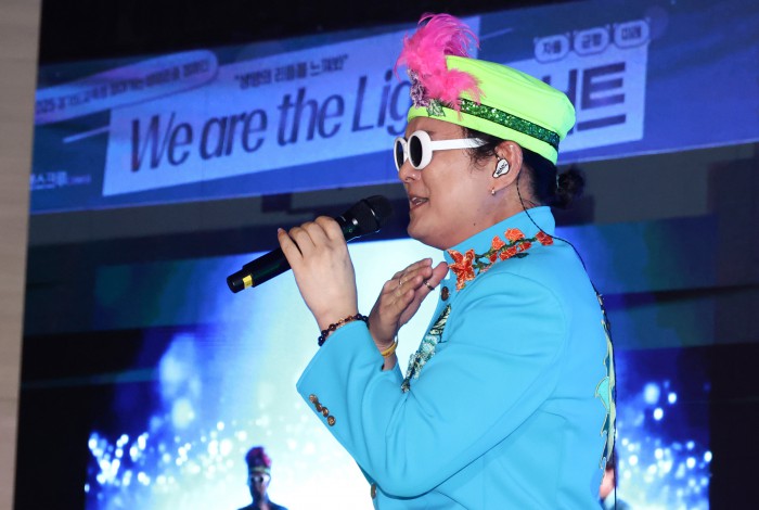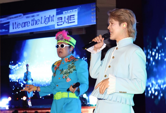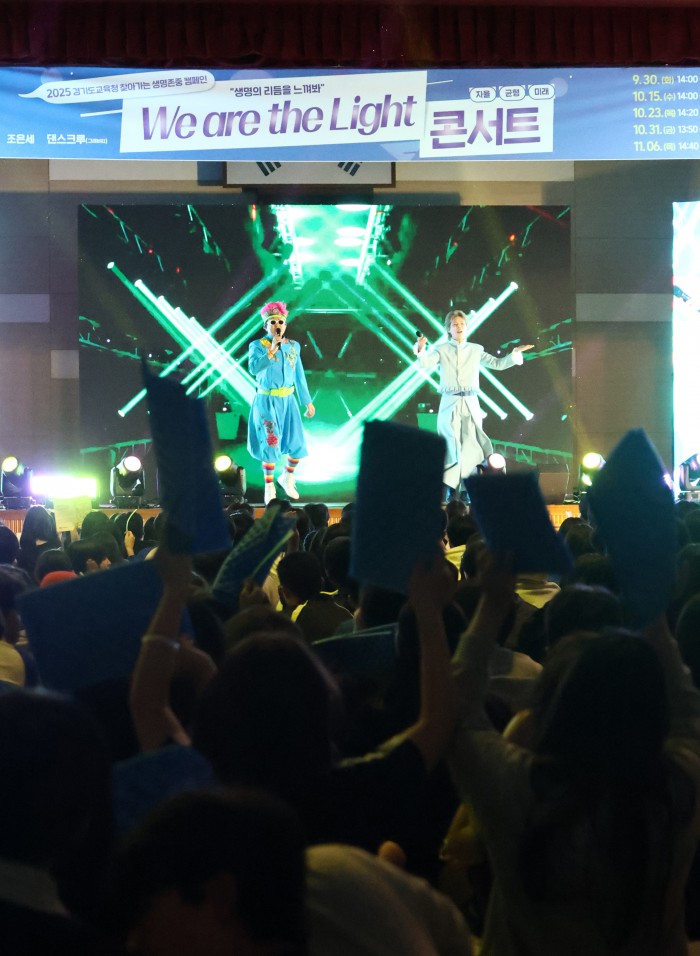 [파주=뉴스핌] 최지환 기자 = 가수 노라조가 15일 오후 경기 파주시 한가람중학교에서 열린 '2025 경기도교육청 찾아가는 생명존중 캠페인'에서 공연을 펼치고 있다. 2025.10.15 choipix16@newspim.com