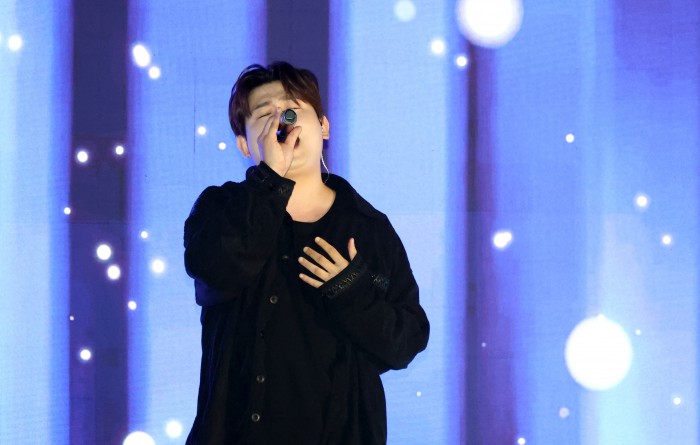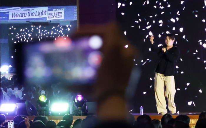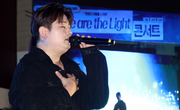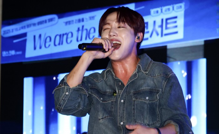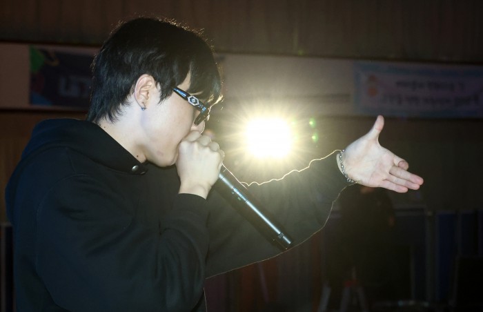 [파주=뉴스핌] 최지환 기자 = 가수 우디가 15일 오후 경기 파주시 한가람중학교에서 열린 '2025 경기도교육청 찾아가는 생명존중 캠페인'에서 공연을 펼치고 있다. 2025.10.15 choipix16@newspim.com