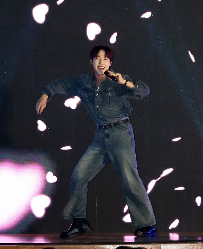 [파주=뉴스핌] 최지환 기자 = 보이그룹 골든차일드의 멤버 이장준이 15일 오후 경기 파주시 한가람중학교에서 열린 '2025 경기도교육청 찾아가는 생명존중 캠페인'에서 공연을 펼치고 있다. 2025.10.15 choipix16@newspim.com