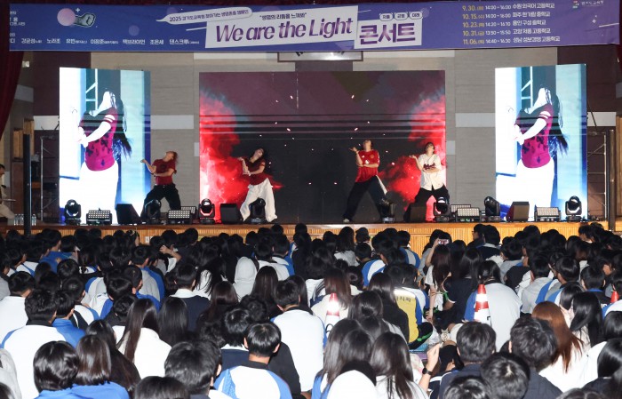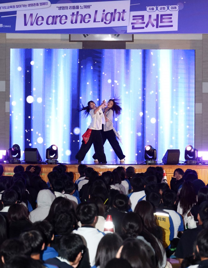 [파주=뉴스핌] 최지환 기자 = 고교댄스크루 그레비티가 15일 오후 경기 파주시 한가람중학교에서 열린 '2025 경기도교육청 찾아가는 생명존중 캠페인'에서 공연을 펼치고 있다. 2025.10.15 choipix16@newspim.com