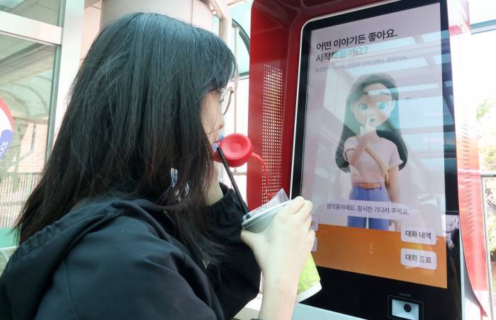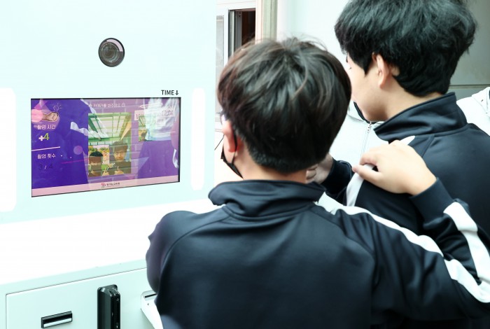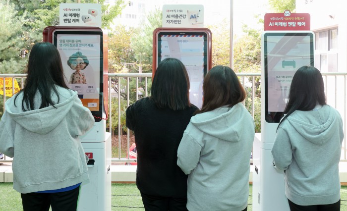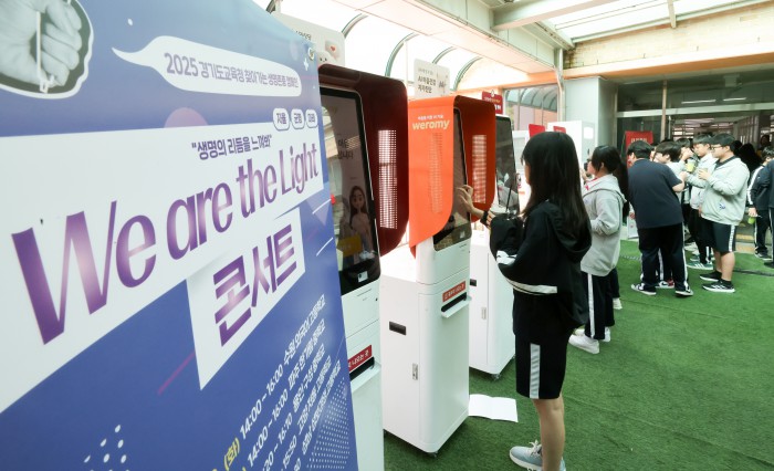 [파주=뉴스핌] 최지환 기자 = 한가람중학교 재학생들이 15일 오후 경기 파주시 한가람중학교에서 열린 '2025 경기도교육청 찾아가는 생명존중 캠페인'에서 AI 기반 마음상담 기기 '위로미'를 체험하고 있다. 2025.10.15 choipix16@newspim.com