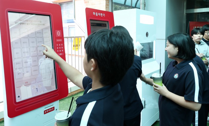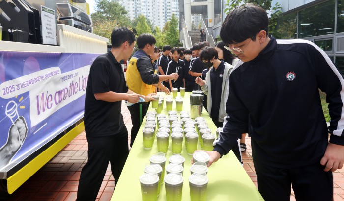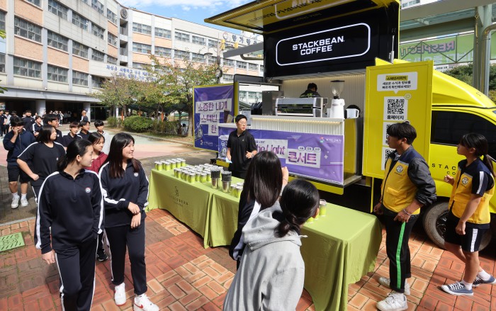 [파주=뉴스핌] 최지환 기자 = 한가람중학교 재학생들이 15일 오후 경기 파주시 한가람중학교에서 열린 '2025 경기도교육청 찾아가는 생명존중 캠페인'에서 스택빈이 후원한 커피차에서 음료를 받고 있다. 2025.10.15 choipix16@newspim.com