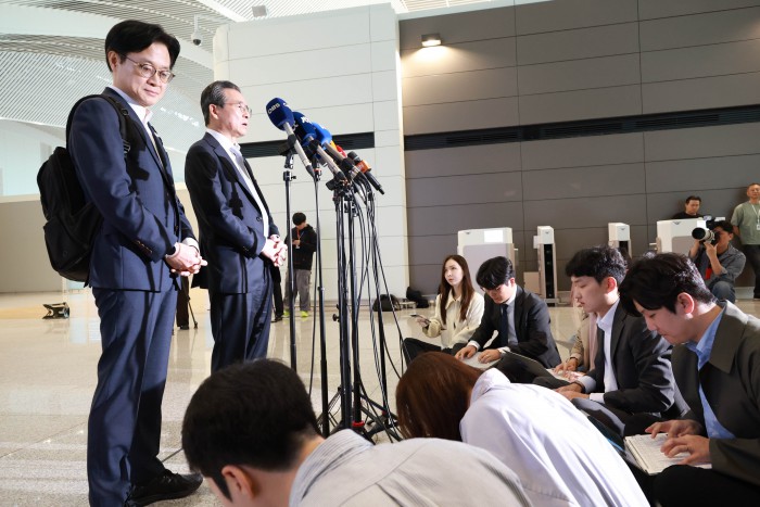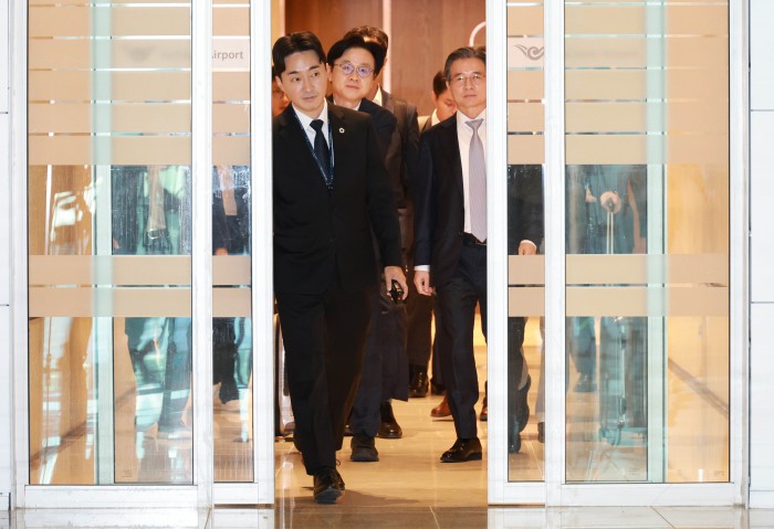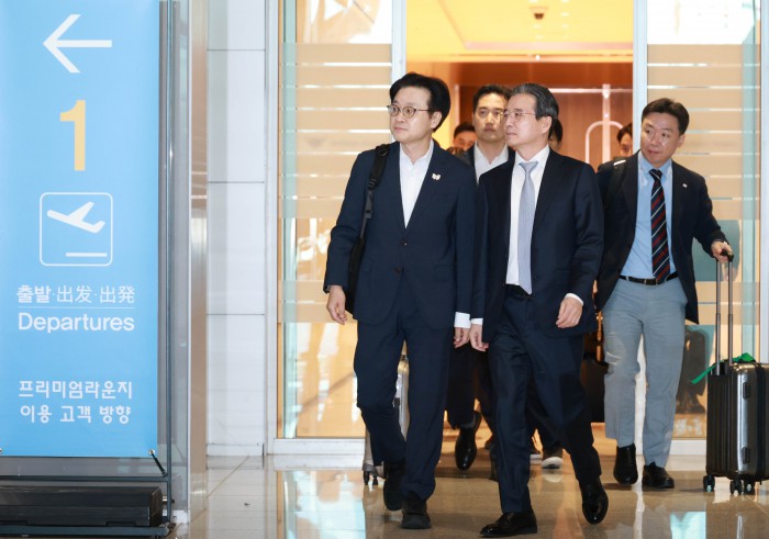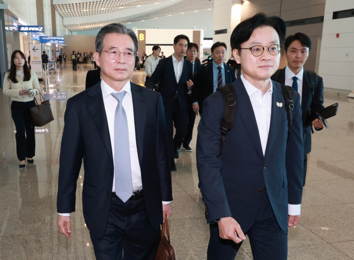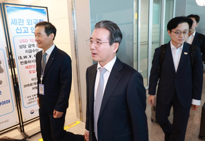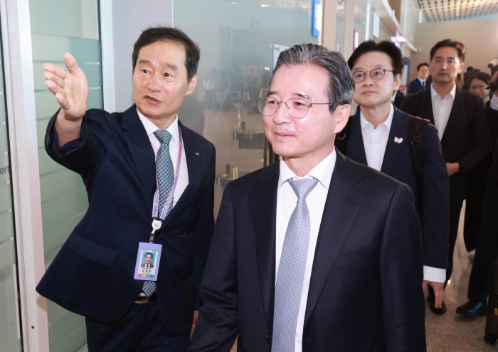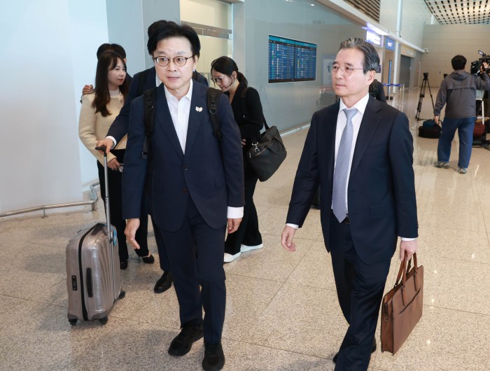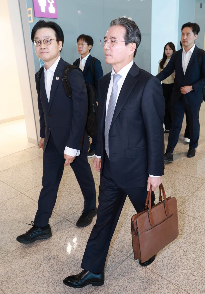 [영종도=뉴스핌] 김학선 기자 = 김용범 대통령실 정책실장과 김정관 산업통상자원부 장관이 16일 한미 관세 협상 후속 협의를 위해 인천국제공항을 통해 미국으로 출국하고 있다. 2025.10.16 yooksa@newspim.com